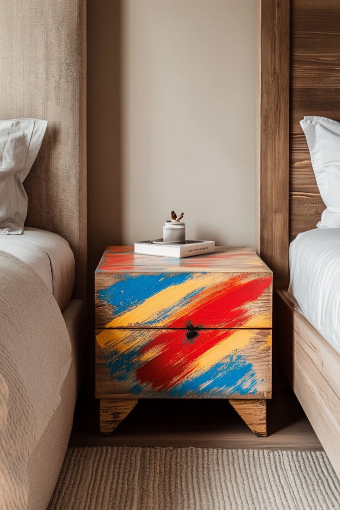 Picture a vintage dresser painted with bold, abstract strokes or intricate floral patterns in vibrant colors. A plain nightstand gets a modern makeover with geometric shapes or hand-drawn motifs. The painted designs add a layer of visual interest and serve as focal points in the room. When light hits the painted surfaces, it creates a playful contrast between matte and glossy finishes, enriching the texture.