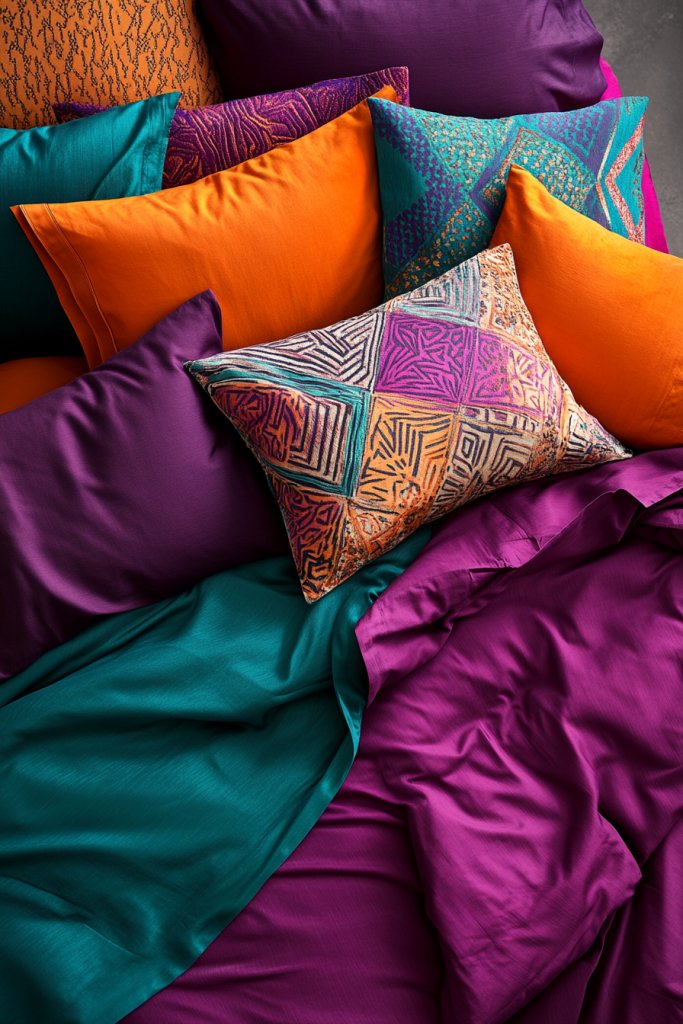 Imagine a bed dressed in a vibrant, patterned duvet cover with mismatched pillows in jewel tones or neon shades. Mixing textures like velvet, silk, or embroidered fabrics elevates the look. Bright pillows in contrasting colors—think teal with coral or yellow with navy—create visual pop. Layering different patterns and sizes adds depth, making the bed look like a curated art piece.