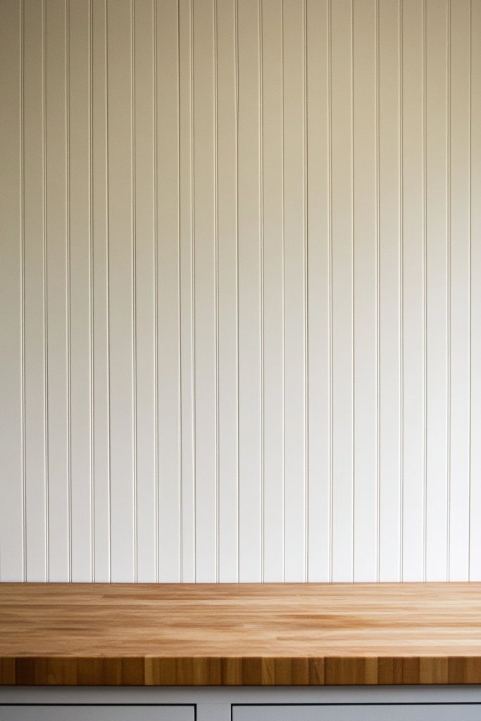 Imagine narrow, vertical wooden planks with rounded edges and bead detailing, painted in soft shades like white, cream, or pastel hues. The paneling runs from countertop to ceiling, emphasizing height and openness. The subtle bead detail creates shadows and highlights, adding depth and visual interest. It’s reminiscent of vintage kitchens and country retreats.