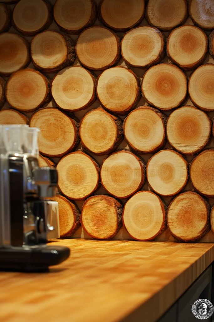Imagine a wall lined with smooth, rounded logs—each one carefully placed to create a pattern that’s both natural and artful. The rich, earthy tones of the wood contrast beautifully with the sleekness of your butcher block countertop. The texture of the logs adds depth, while their rounded edges soften the overall look. Light plays off the curved surfaces, creating subtle shadows that bring the entire wall to life.