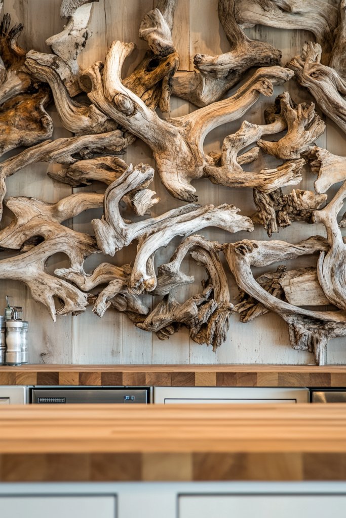 Picture a wall adorned with pieces of weathered driftwood, arranged in a deliberate pattern or abstract design. The natural textures and irregular shapes of each piece add depth, while their faded, sun-bleached tones evoke memories of peaceful shores. The contrast between rough wood and smooth, polished surfaces nearby makes the space feel layered and inviting. Soft natural light enhances the organic beauty of each driftwood element.