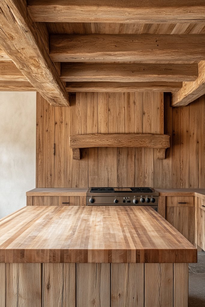 Visualize timber beams running across the ceiling, their rough-hewn texture contrasting with smooth, polished surfaces below. The natural wood tones, from honey to deep chestnut, blend effortlessly with your butcher block countertops. The combination of exposed beams and natural wall finishes creates layers of texture and warmth, making the space feel authentic and lived-in. Soft lighting highlights the wood grain, emphasizing the craftsmanship.