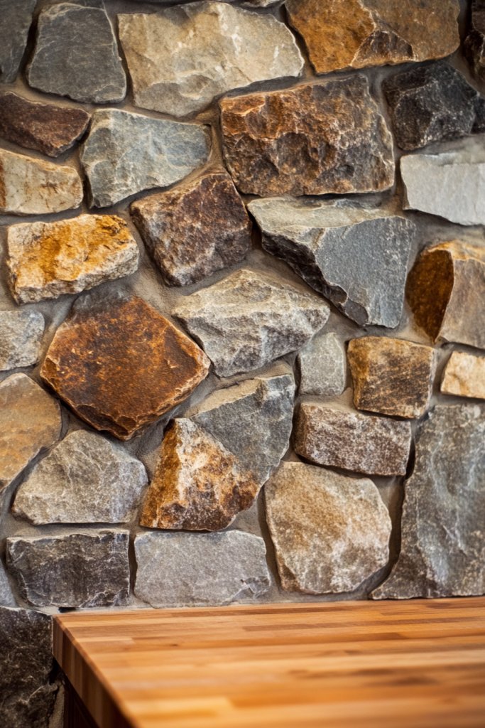 Envision rough-hewn stone in shades of gray, beige, and brown, stacked meticulously to form a rugged yet refined surface. Each stone’s unique shape and texture catch the light differently, creating a dynamic visual effect. The stones extend from countertop to ceiling, emphasizing height and grandeur. Their natural variations evoke a sense of earthy authenticity, transforming the space into a rustic sanctuary.
