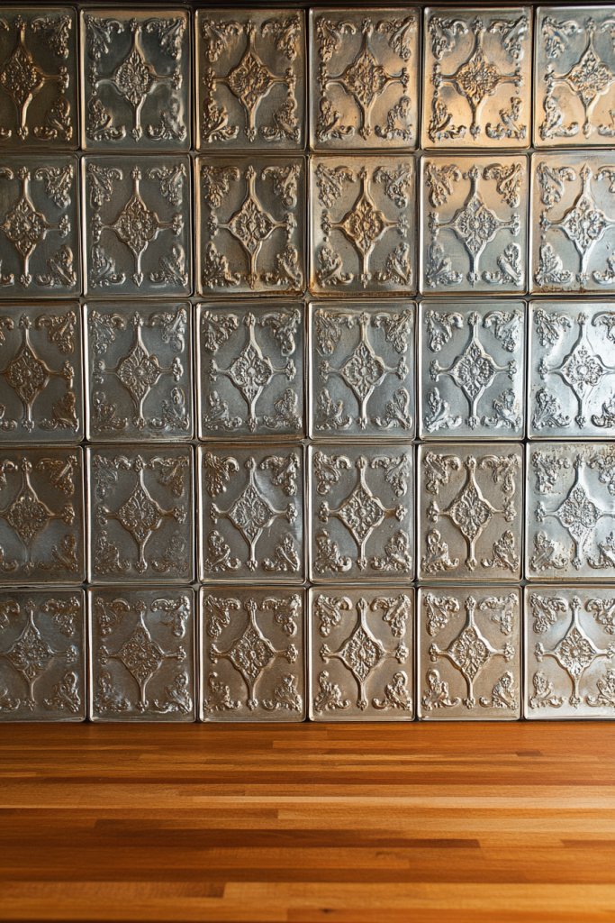 Imagine embossed metal tiles with intricate patterns, aged to perfection with a patina that hints at decades of history. Their reflective surface catches the light, creating a subtle shimmer that energizes the space. The tiles are arranged in a grid pattern, with some showing slight imperfections or rust spots, emphasizing their vintage appeal. This combination of rustic and industrial elements results in a truly striking backdrop.