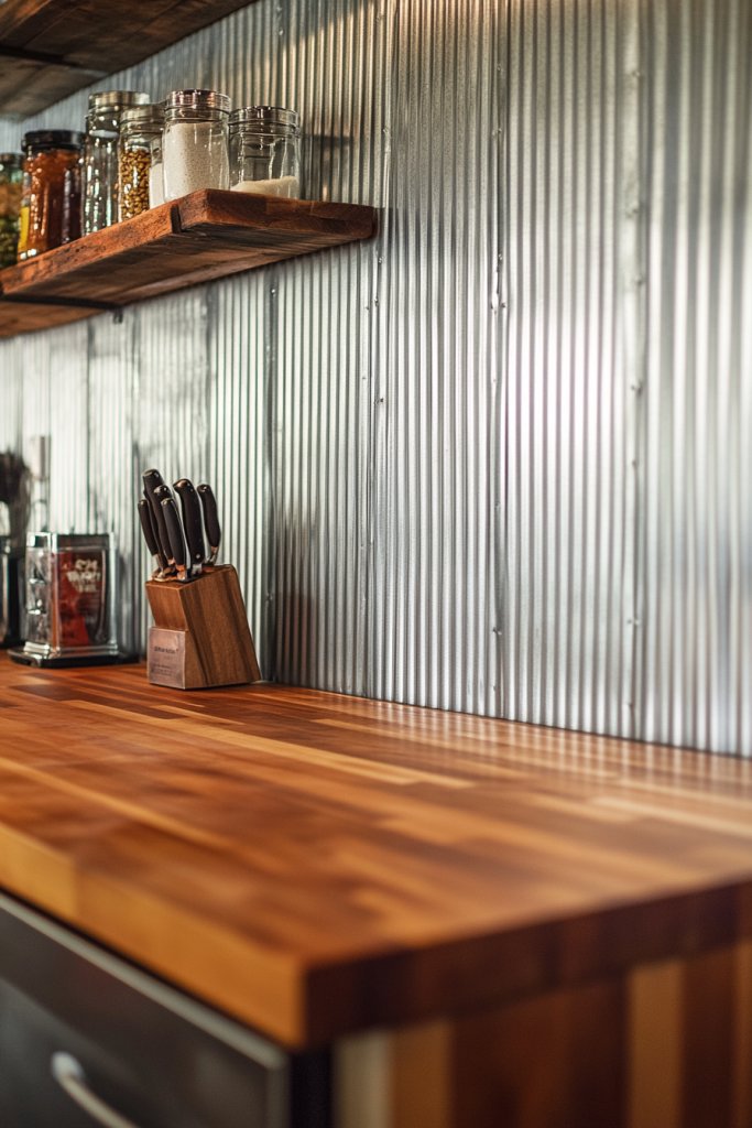 Craving a bold, contemporary twist on rustic charm? Corrugated metal sheets bring an edgy, industrial vibe that still feels warm and inviting. They create a striking contrast with the natural tones of butcher block countertops. If you want to make a statement while maintaining rustic roots, this is your go-to solution.