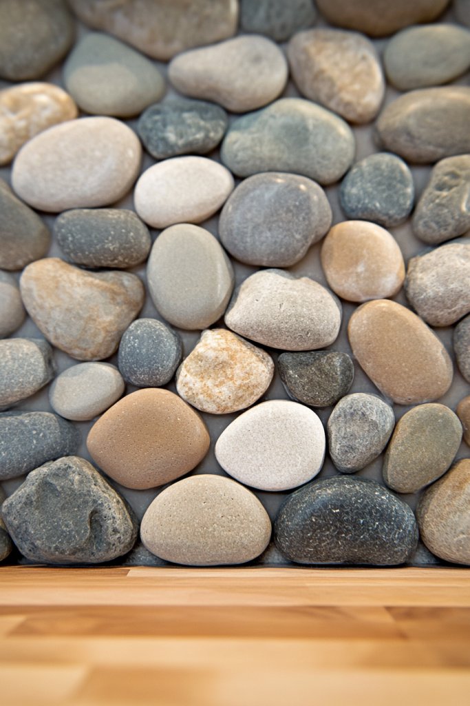 Imagine small, smooth stones in shades of gray, tan, and muted blues arranged tightly together. The surface is textured, with some stones protruding slightly for a tactile feel. The natural variation in size and color adds visual interest, mimicking a riverbed or beach shoreline. The glossy or matte sealant enhances their natural beauty, making the whole wall feel like a calming landscape.