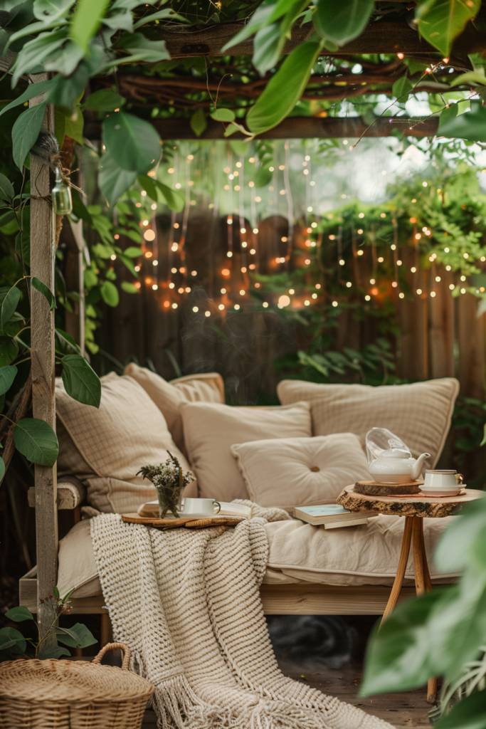 Add a small side table to hold a warm cup of tea and a stack of novels, while delicate string lights twinkle above, casting a warm glow as dusk settles in. Consider a rustic wooden arch or trellis for added charm, adorned with climbing vines and fairy lights.
