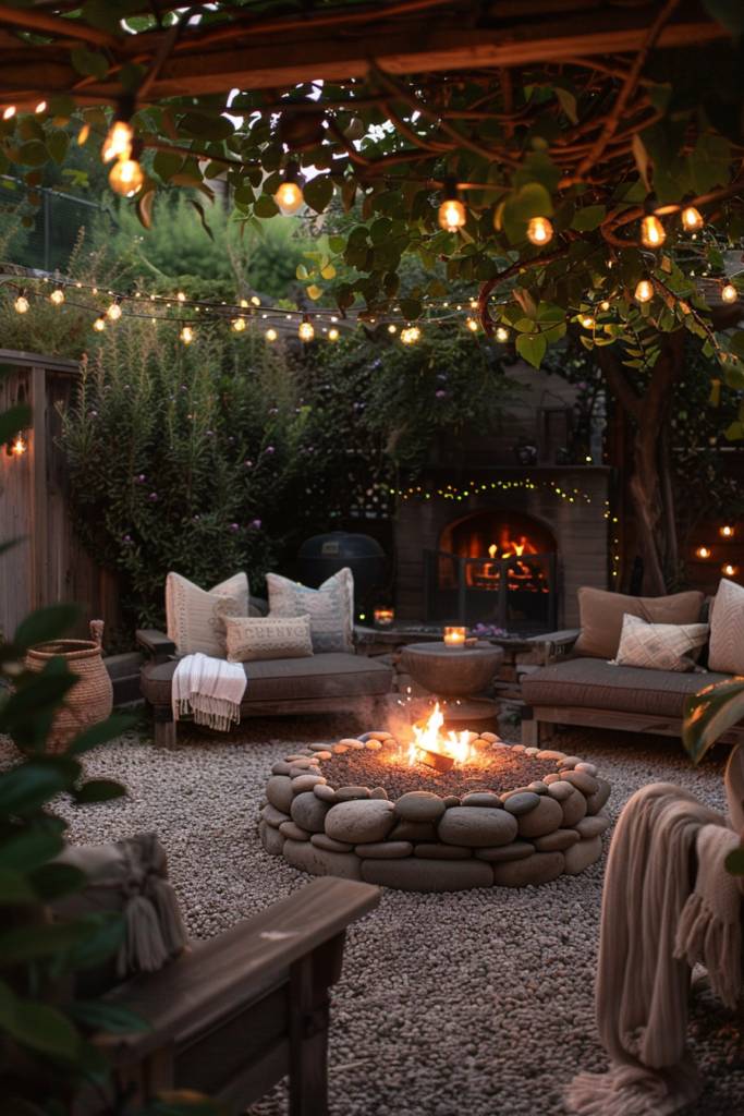 Imagine a cozy fire pit area where the warmth of flickering flames invites you to gather with family and friends under the stars. Surround your fire pit with comfortable seating—think plush cushions and soft blankets that beckon you to sink in and relax. Incorporate natural elements, like stone or rustic wood, to create a welcoming atmosphere that harmonizes with your backyard oasis.