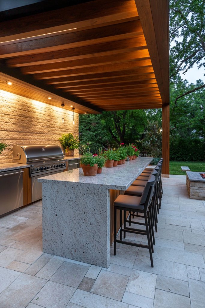 Consider incorporating smart technology, like a built-in sound system or temperature controls, making cooking and entertaining a seamless affair. Surround yourself with lush greenery and cozy seating, creating an atmosphere that encourages gathering.