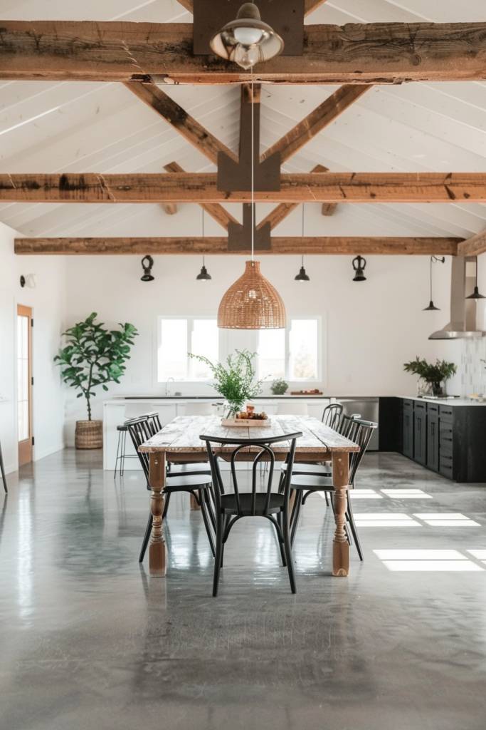 Consider an open layout that seamlessly connects the dining area to the kitchen, making it easier to serve and enjoy food. You might add pendant lighting above the table to create a warm ambiance, while also providing practicality for evening dinners. Incorporating earthy tones in your decor can enhance the modern rustic appeal, giving the space a cozy yet stylish vibe. With thoughtful design choices, your dining area can become the heart of your barndominium, where memories are made and cherished.