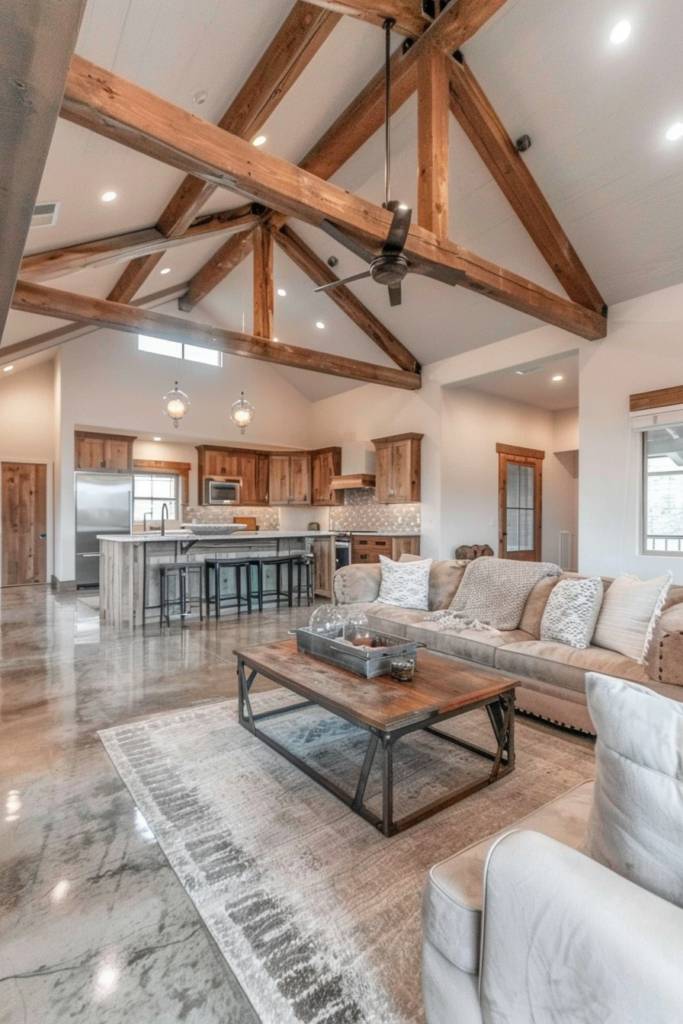 The warmth of an open concept living space sets the perfect stage for introducing rustic wood beams and accents, which add character and charm to your home. Imagine sturdy, exposed beams stretching across the ceiling, creating a stunning focal point while enhancing the overall ambiance. These beams can be left in their natural state or stained to complement your design palette, seamlessly blending with other elements.