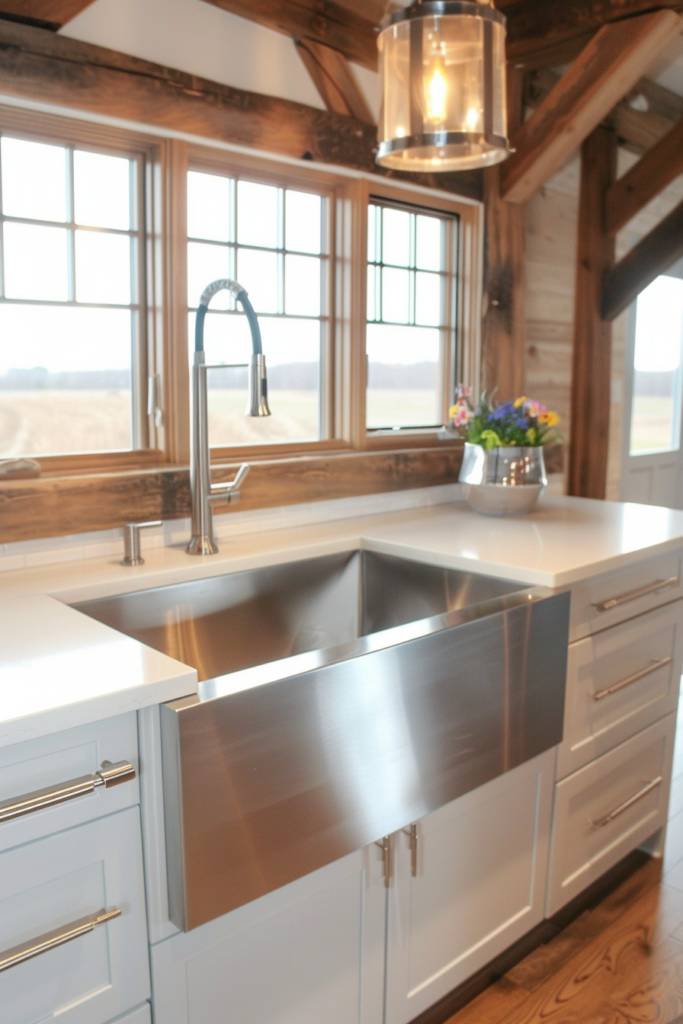 Farmhouse sinks come in various materials, like fireclay, stainless steel, or cast iron, allowing you to choose one that complements your overall aesthetic. Additionally, their durability guarantees they’ll withstand daily use while maintaining their beauty.