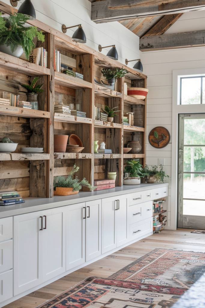 You can choose materials that complement your barndominium’s rustic aesthetic, like reclaimed wood or metal accents, creating an inviting yet modern vibe. Customization options also include varying shelf heights and widths, allowing you to tailor the design to your specific needs.