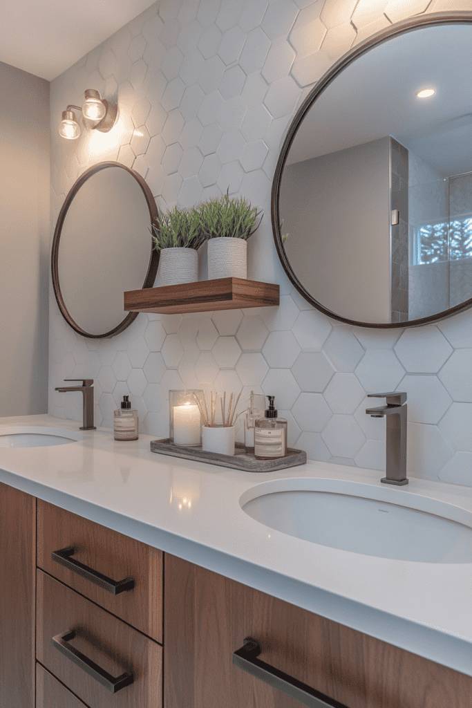 For shared bathrooms, dual round mirrors above a double vanity provide both functionality and style. Their symmetry creates a harmonious look, while the soft curves add balance to sharp geometric elements, such as hexagonal tiles. Wooden accents and warm lighting complete this inviting, modern design.
