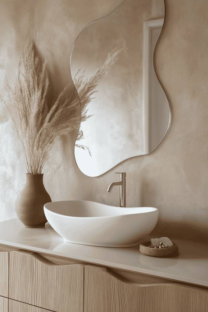 A freeform mirror with smooth, irregular edges mimics the shapes found in nature, adding softness and a modern touch to your bathroom. Paired with neutral tones, a sculptural sink, and pampas grass accents, it creates an organic, serene atmosphere. This mirror style works beautifully in contemporary or bohemian spaces.