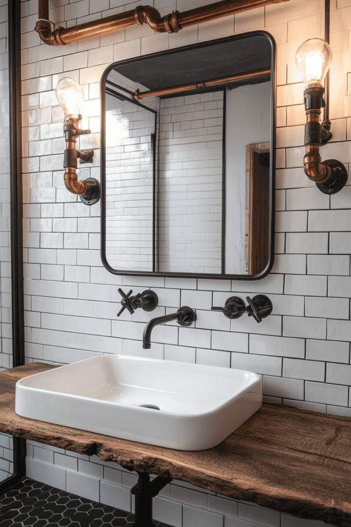 Make a bold statement with a mirror framed by industrial-style piping. This design pairs seamlessly with subway tiles and a rustic wooden countertop, bringing a cohesive urban aesthetic to the space. The copper or black finish of the pipes adds warmth and character while emphasizing the industrial theme.