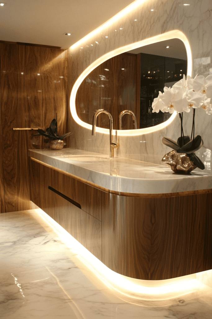 A custom backlit curved mirror creates a luxurious and futuristic vibe. Its smooth, fluid shape and integrated lighting add drama and sophistication to any modern bathroom. Pair it with high-gloss finishes, marble surfaces, and gold fixtures for a striking, upscale design.