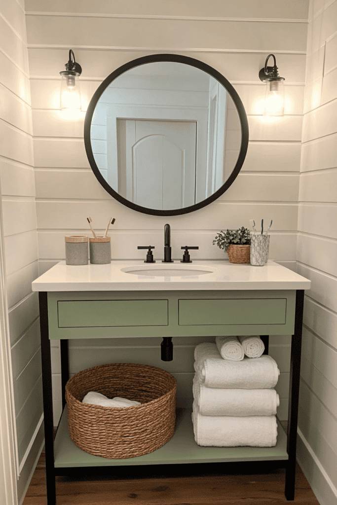 A simple round mirror paired with shiplap walls and a compact vanity creates a charming and functional nook. The black frame adds a subtle contrast, while warm pendant lighting completes the inviting, farmhouse-inspired aesthetic. Add a pop of color with a painted vanity to personalize the space.