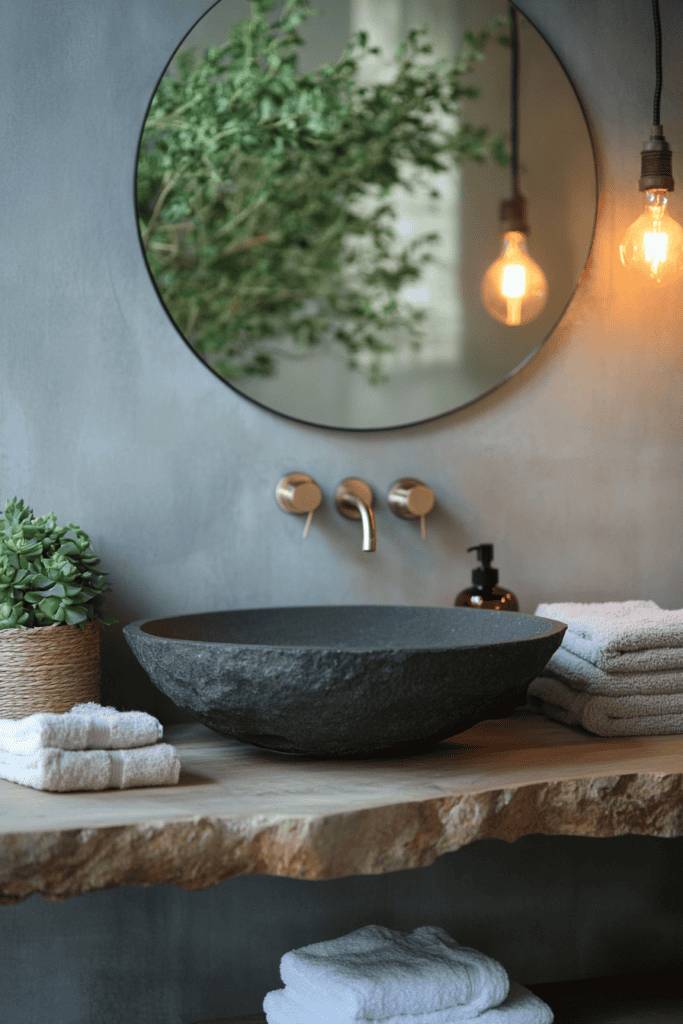Add a touch of organic charm to your bathroom with a round mirror above a live-edge wooden countertop. The simplicity of the round design contrasts beautifully with the natural textures of the wood and the raw stone basin. Complementing this setup with warm, industrial lighting enhances the rustic aesthetic and creates a cozy, inviting atmosphere.