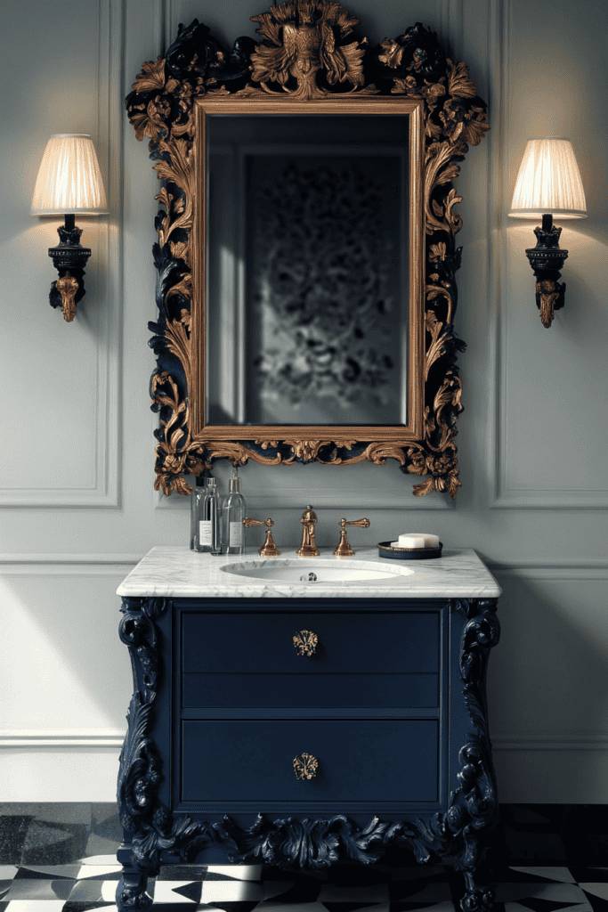 For those drawn to a vintage or opulent style, an ornate gold-framed mirror is a stunning choice. This intricately detailed mirror adds a sense of grandeur to any bathroom. When paired with a navy vanity and marble countertop, it creates a sophisticated focal point. To complete the look, add vintage-inspired wall sconces for a timeless feel.