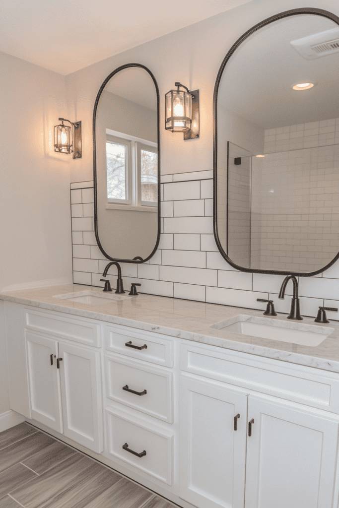 Arched mirrors bring an elegant and soft architectural element to double vanities. The curved edges add visual interest, breaking up the harsh lines often found in bathroom design. This style works especially well in modern farmhouse bathrooms, as seen with white cabinetry and black fixtures. The symmetry creates a balanced, polished look.
