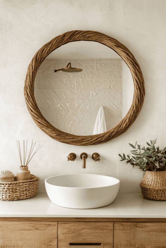 A round mirror with a woven frame brings bohemian charm and warmth to your bathroom. The natural textures of the frame work beautifully with neutral tones, wooden accents, and soft greenery. It’s the perfect addition to a space that prioritizes relaxation and natural beauty. Pair it with soft lighting to highlight the intricacy of the woven design.