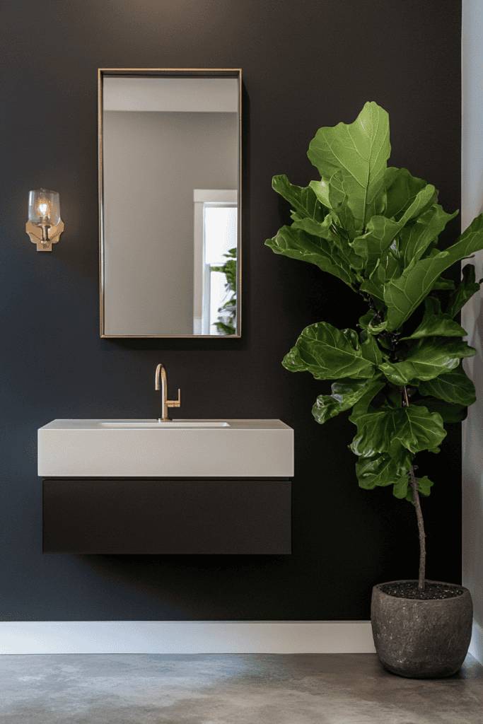 A minimalist rectangular mirror can feel dramatic when paired with dark, moody walls and gold fixtures. The clean lines of the mirror allow the surrounding elements, such as bold lighting or a statement plant, to shine. This combination creates a modern yet inviting atmosphere, perfect for a sophisticated bathroom retreat.