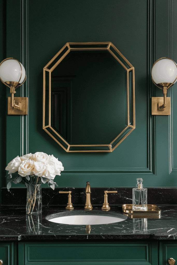 An octagonal mirror framed in gold adds geometric elegance to your bathroom. This unique shape blends traditional and modern styles, making it a versatile choice. When paired with deep green walls and brass fixtures, the mirror becomes a stunning focal point. Add luxurious elements like marble countertops or fresh flowers to enhance the glamour.