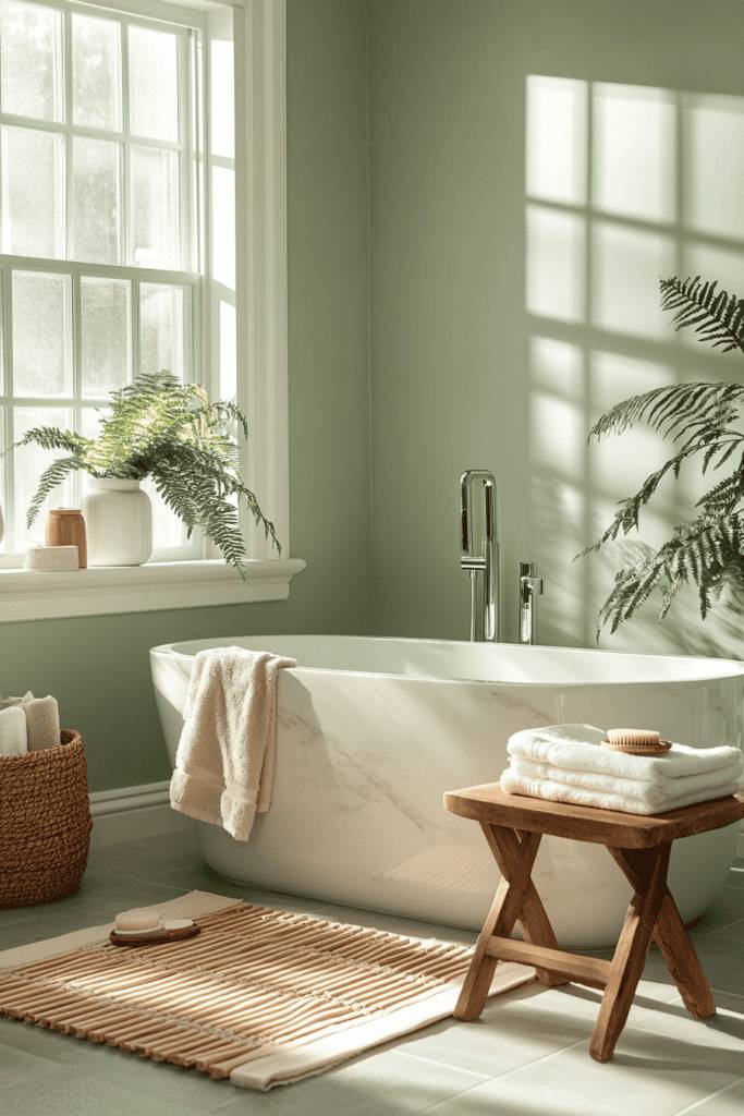 Sage green is the perfect paint color for a serene, spa-like bathroom. Its soft, earthy tone creates a calming environment, ideal for relaxation. Pair it with natural accents like wooden stools, woven baskets, and lush greenery to amplify the organic vibe. This shade works beautifully in bathrooms with plenty of natural light, as it enhances the tranquil ambiance without overpowering the space.