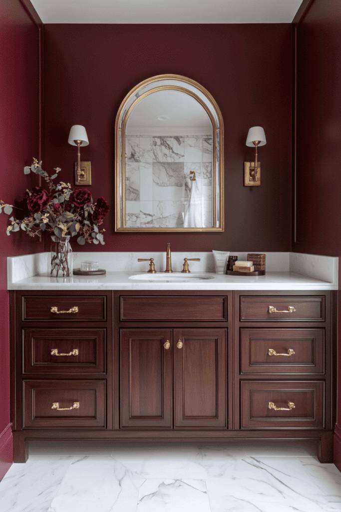 Deep burgundy adds drama and luxury to any bathroom. This bold shade pairs beautifully with dark wood cabinetry, gold hardware, and white marble accents for a rich and sophisticated look. The color exudes warmth and opulence, making it perfect for creating a statement in a larger bathroom.