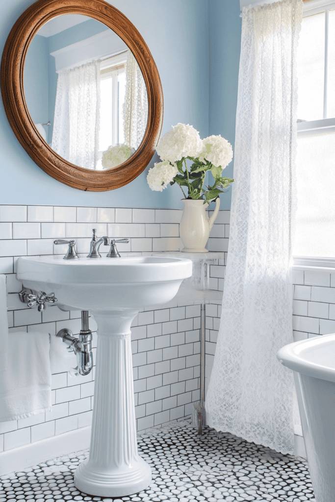 Sky blue is a refreshing choice for a light and airy bathroom. This shade works beautifully with crisp white subway tiles, lace curtains, and vintage-style pedestal sinks. The cool tone evokes a sense of tranquility and is perfect for brightening up smaller spaces.