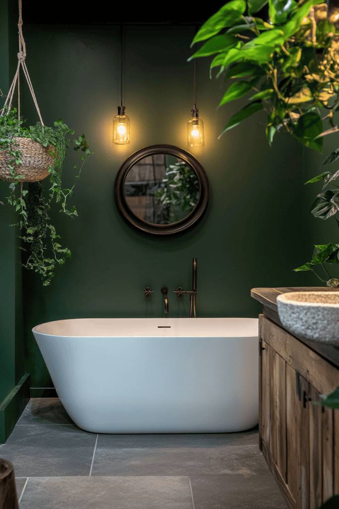 For a bold and dramatic look, jungle green adds an exotic touch to your bathroom. Paired with hanging plants, textured wood accents, and soft lighting, this color transforms the space into a lush, spa-like oasis. The deep hue works best in bathrooms with plenty of natural or artificial lighting.