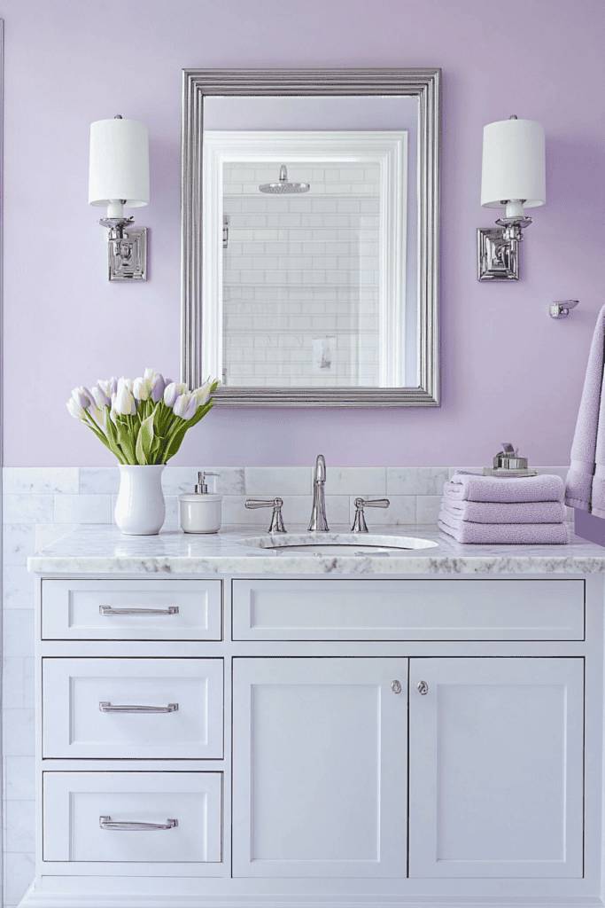 Lavender creates a serene and soothing atmosphere, perfect for a bathroom retreat. Its delicate hue pairs effortlessly with silver fixtures and white marble accents, as shown here. Lavender also complements fresh floral arrangements, such as a vase of lavender sprigs, to complete the calming spa vibe.