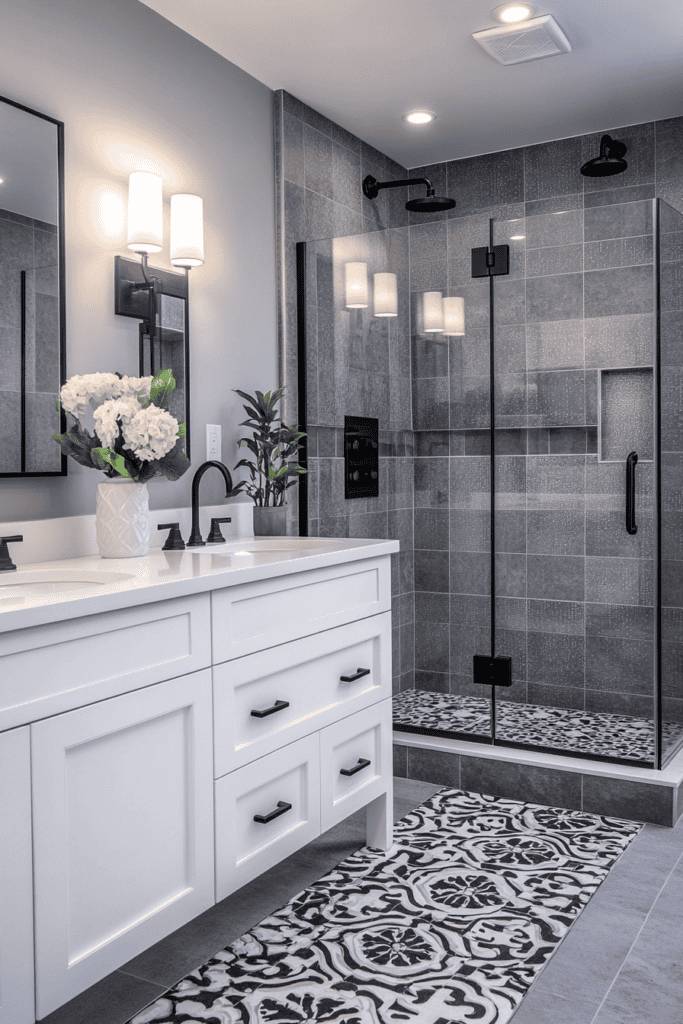 Charcoal gray adds a touch of sophistication and modern elegance to any bathroom. Its versatility allows it to complement sleek fixtures, like black matte shower frames and white cabinetry, while the depth of the color creates a bold yet understated look. Accentuate the design with patterned tiles or floral accents for a striking contrast.