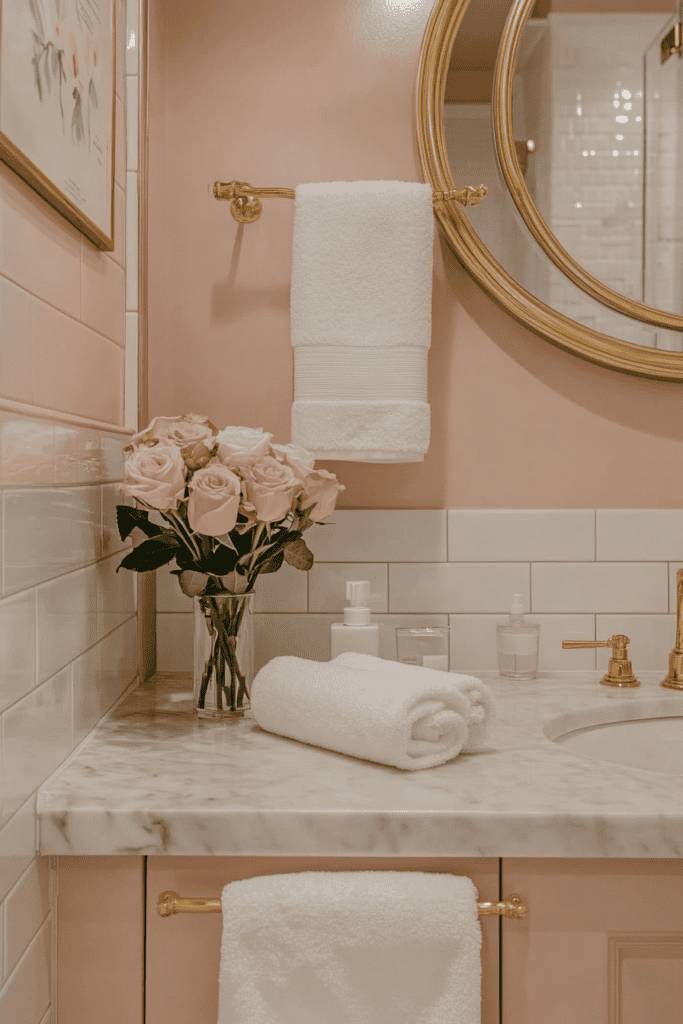 Blush pink is an elegant choice for creating a delicate and feminine bathroom. Its soft hue pairs perfectly with gold fixtures, white marble countertops, and floral décor for a touch of timeless luxury. This color is ideal for small bathrooms, as its light tone reflects natural light, making the space feel airy and bright.