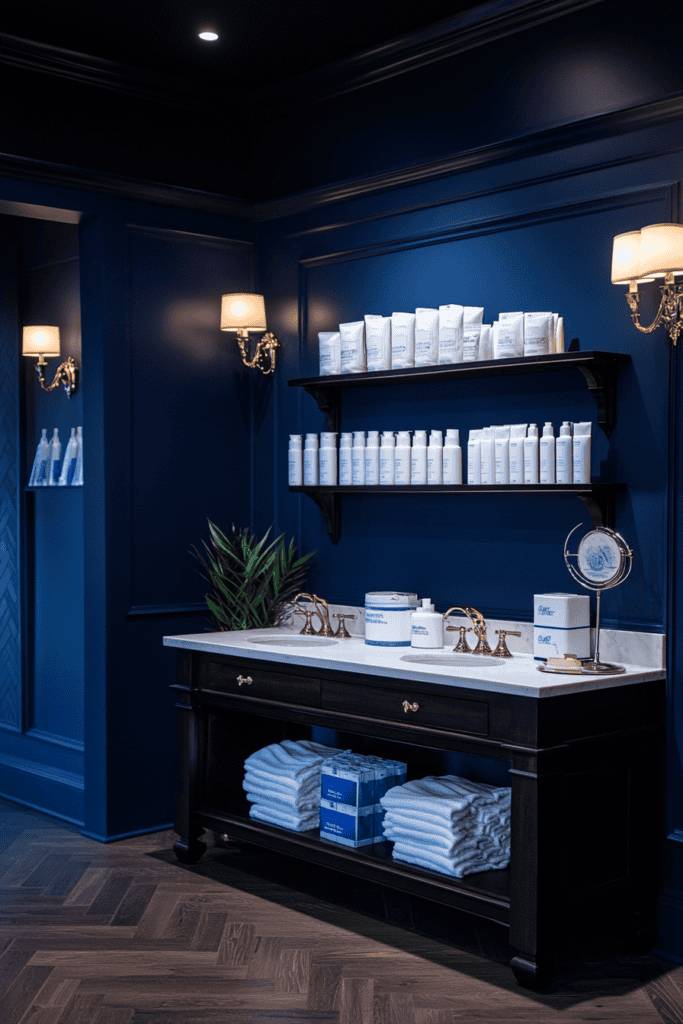 Navy blue is a statement color that brings depth and drama to any bathroom. Its rich tone works well with contrasting white accents and luxurious gold finishes, creating a timeless and sophisticated aesthetic. Incorporate navy paneling or pair the color with dark wood flooring for a cohesive and striking look.