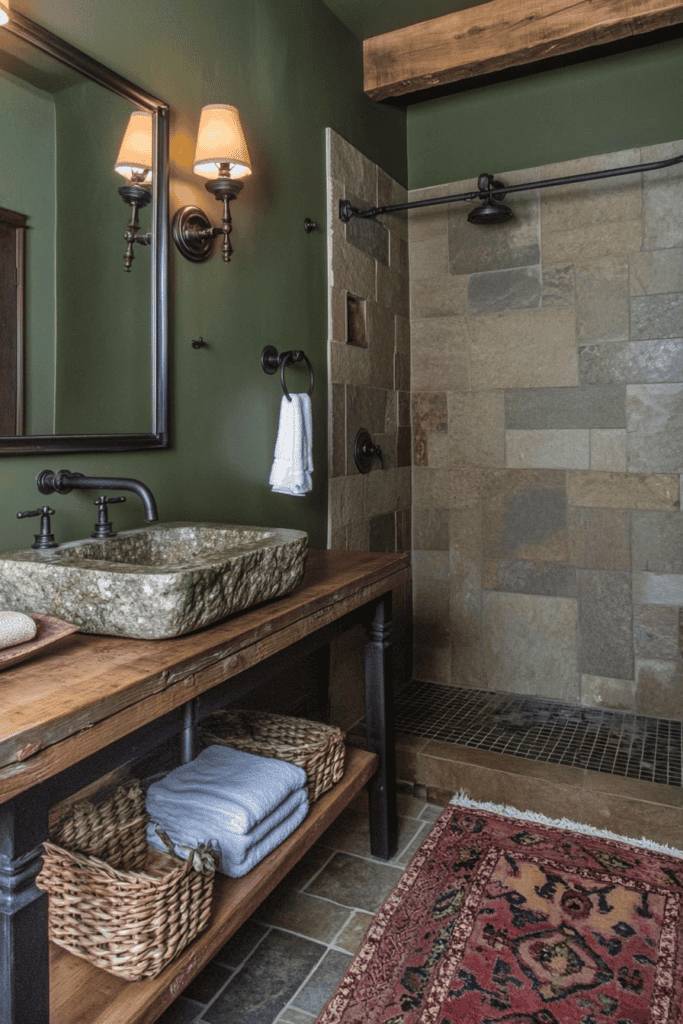 Earthy olive green brings a natural and cozy feel to the bathroom, especially when paired with textured stone tiles and wooden accents. This rich tone complements rustic or farmhouse styles, creating a space that feels grounded and inviting. Add warm lighting and woven baskets for a cohesive look.