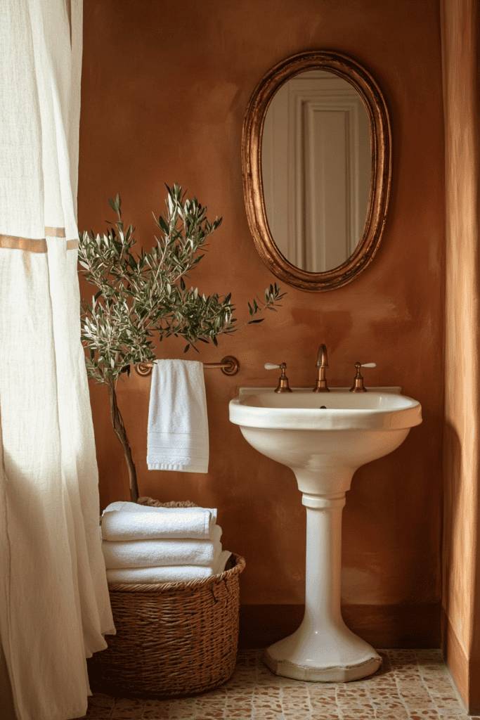 Terracotta adds warmth and character to a bathroom with its sun-kissed, earthy vibe. This color works wonderfully in Mediterranean or Tuscan-inspired spaces. Pair it with gold fixtures, natural textures like wicker, and light curtains to emphasize its cozy yet elegant charm.