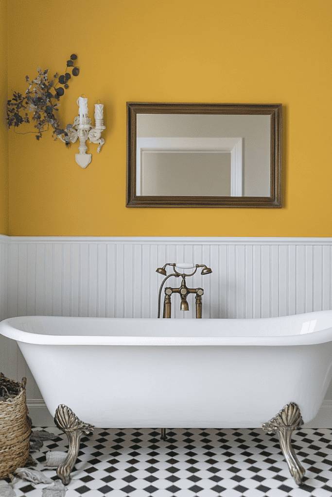 Mustard yellow creates an energetic and cheerful atmosphere in the bathroom. It’s a bold choice that works well in eclectic or vintage designs. Pair it with white wainscoting and a classic clawfoot tub for a striking yet balanced look. Brass fixtures can further enhance the vibrant tone of the walls.