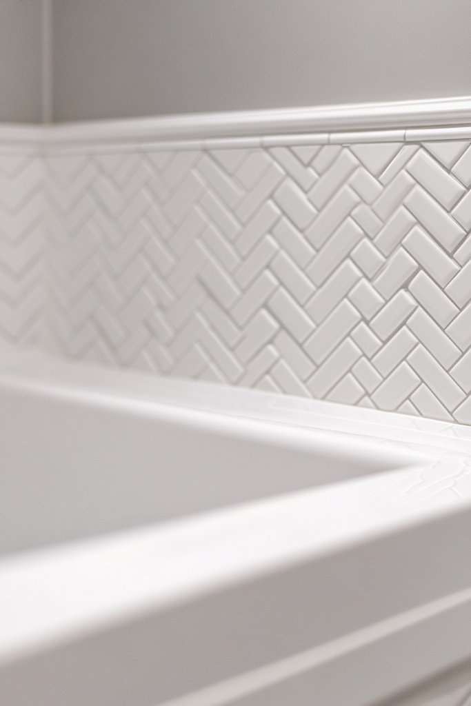 It’s the kind of detail that makes guests do a double-take and leaves you feeling proud every time you step in. Picture sleek white subway tiles laid out in a zigzag herringbone pattern, catching the light and creating a subtle movement across the wall.