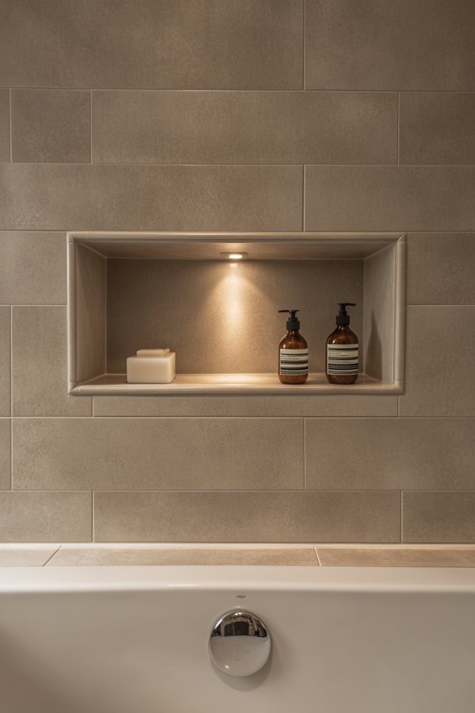 Tired of clutter ruining your bathroom’s sleek look? Integrated niche shelves with contrasting tile accents offer a smart, beautiful solution. They provide handy storage while adding architectural interest.