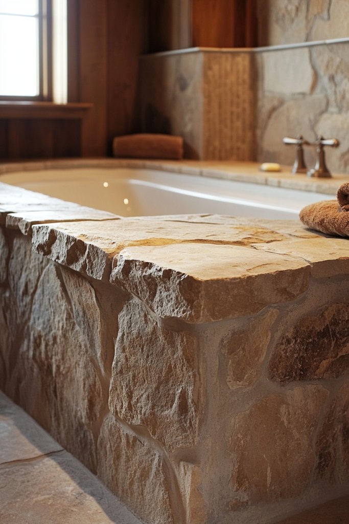 Highlight the texture with directional lighting—like wall-mounted sconces—to create dramatic shadows. Incorporate accessories that complement the tactile theme, such as textured towels or sculptural soap dishes.