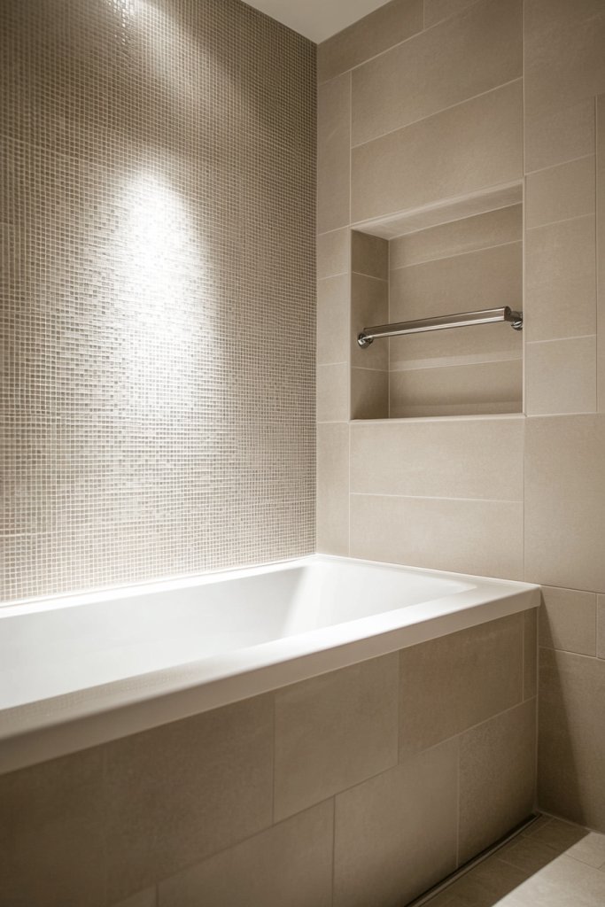 Mix textured tiles with smooth ones for a layered look. For extra visual intrigue, incorporate decorative niches or ledges within the pattern.