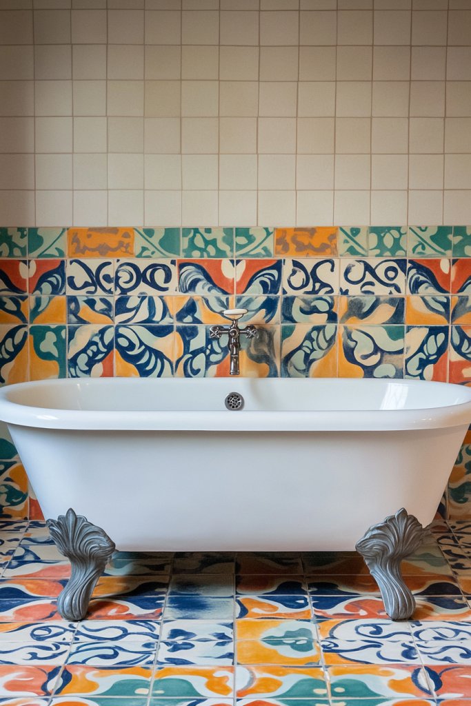 The rich colors and details give the space a cozy, vintage vibe. Mix patterned cement tiles with plain tiles or painted walls for balance.