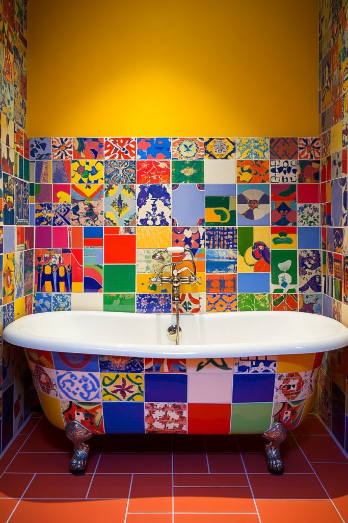 Want to inject fun and personality into your bathroom? Bold colored tiles arranged in a random pattern create a playful yet elegant vibe. They turn a mundane space into a lively, colorful sanctuary.