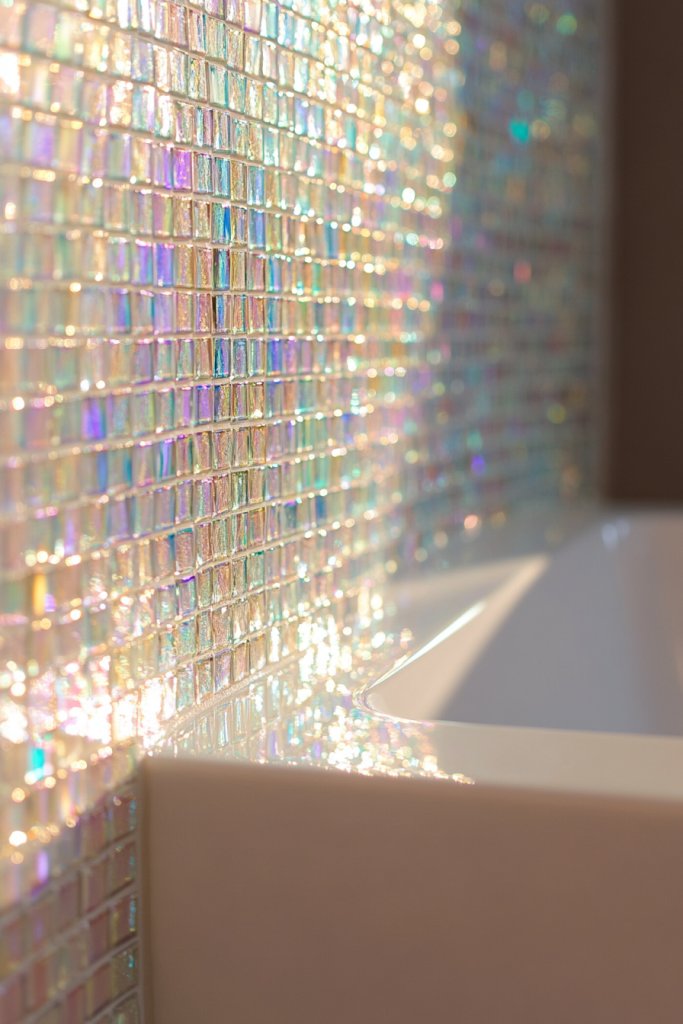 As you move around the room, the tiles reflect light differently, giving the walls a lively, jewel-like appearance. The glossy surface enhances the iridescence, making the space glow with soft, colorful highlights.