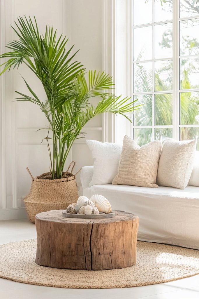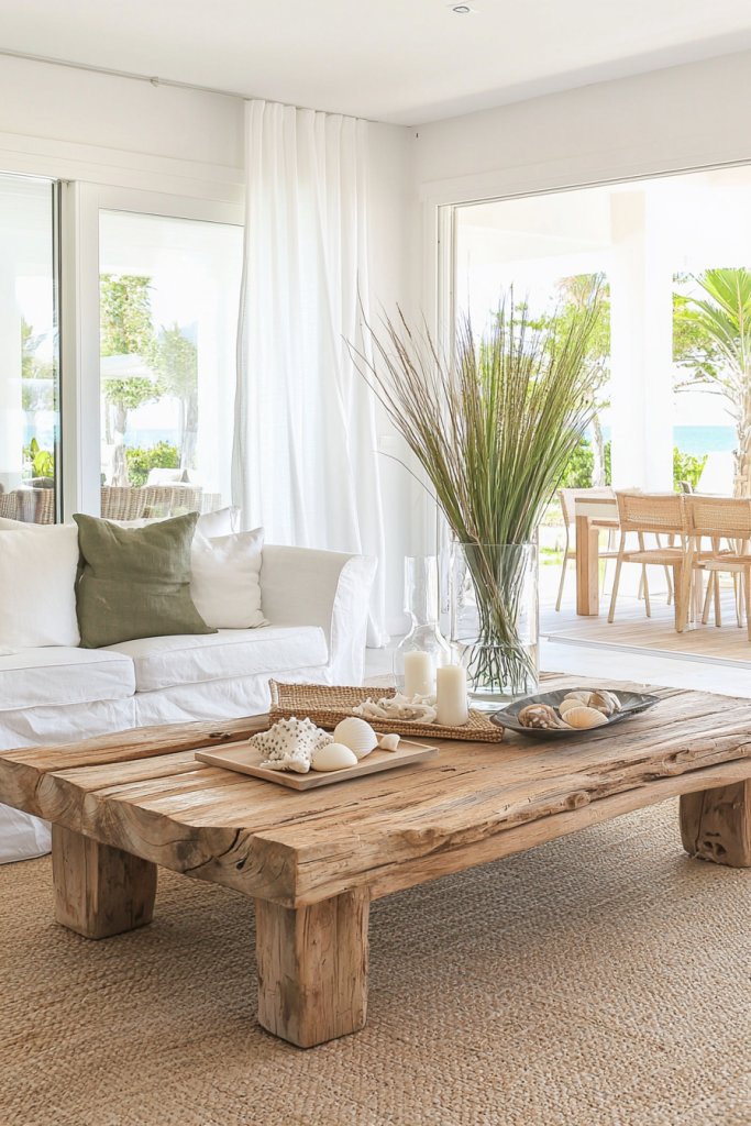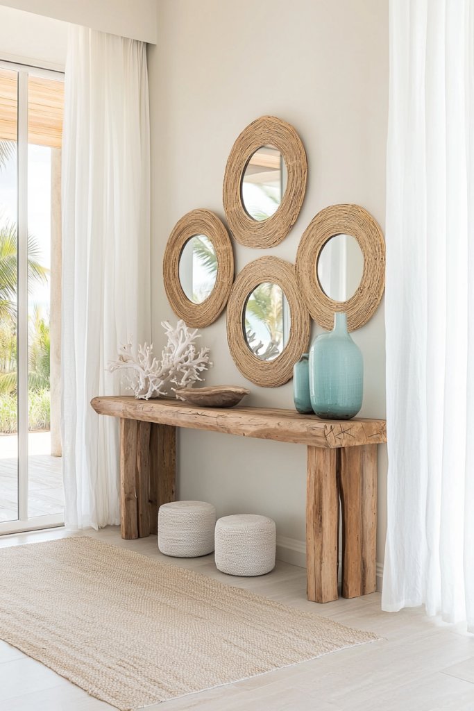 Start with a weathered console table, topped with a few seashells and a driftwood mirror that reflects natural light, making the space feel airy and open. Layer the floor with a jute or sisal rug that brings in texture while echoing the beach beneath your feet.