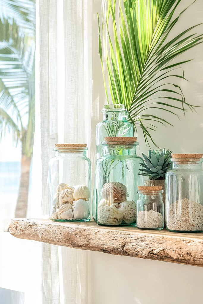 Imagine grouping different-sized jars on a wooden shelf, each filled with reminders of sun-soaked days by the sea. You can also use them for practical storage, like holding kitchen essentials or bath accessories.