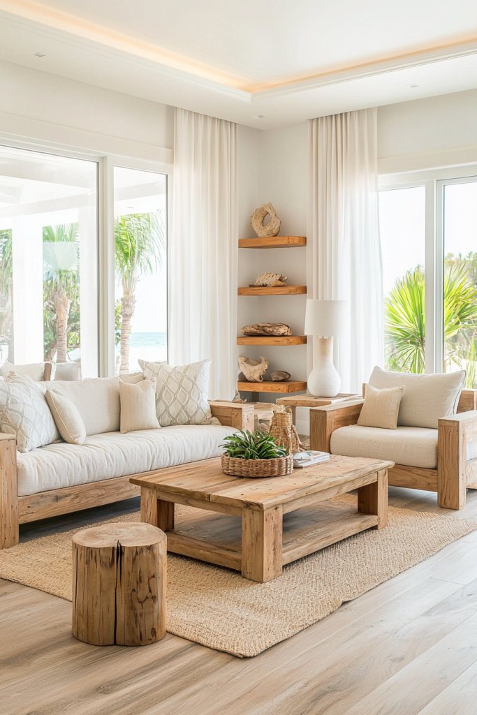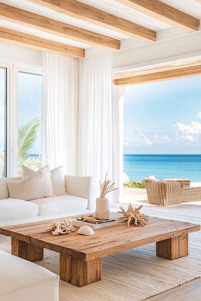 You could adorn your walls with wooden panels or create a stunning focal point using driftwood art. Consider using furniture pieces like a rustic coffee table or a weathered sideboard, which can seamlessly blend with your coastal theme.
