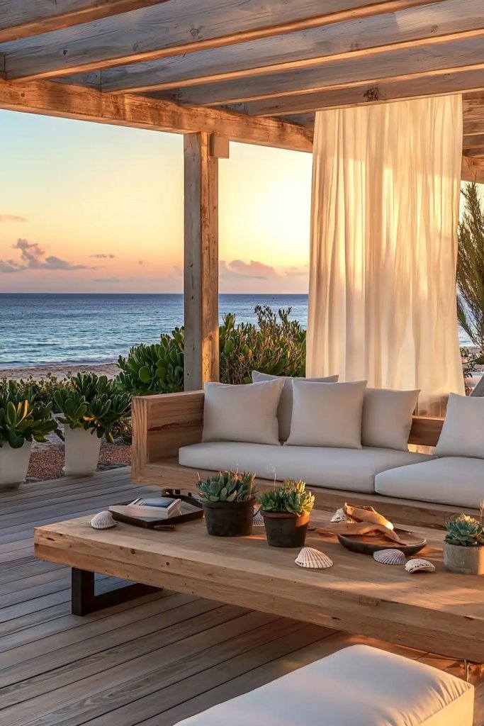 How can you turn your outdoor space into a serene retreat that echoes the beauty of the beach? Start by incorporating soft, flowing fabrics for your outdoor furniture. Think airy linen cushions and lightweight throws that invite relaxation.